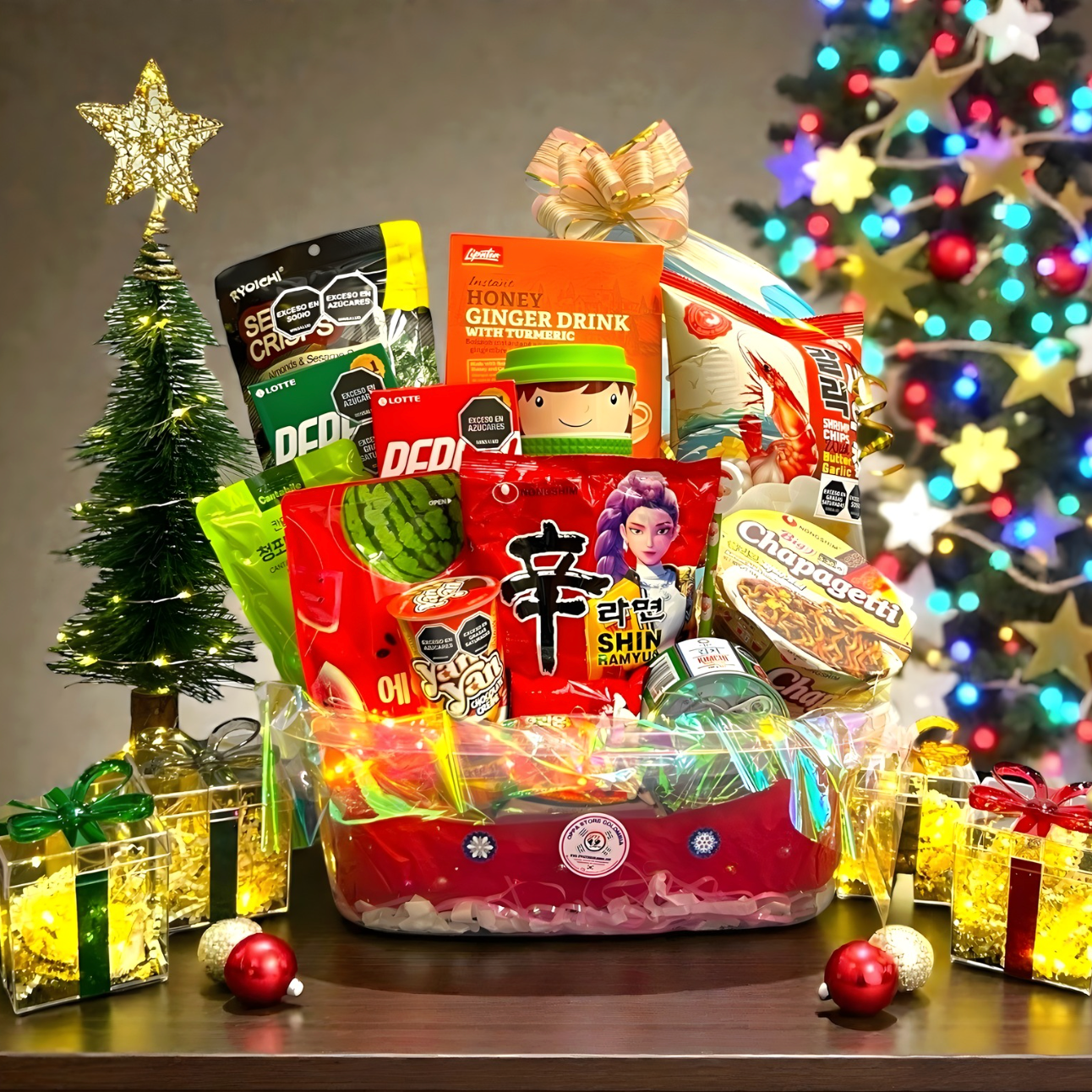 Cada producto ha sido cuidadosamente seleccionado para ofrecer una combinación deliciosa de snacks icónicos, ramen coreano, bebidas refrescantes y un toque cálido con té tradicional, todo presentado en un encantador empaque navideño.