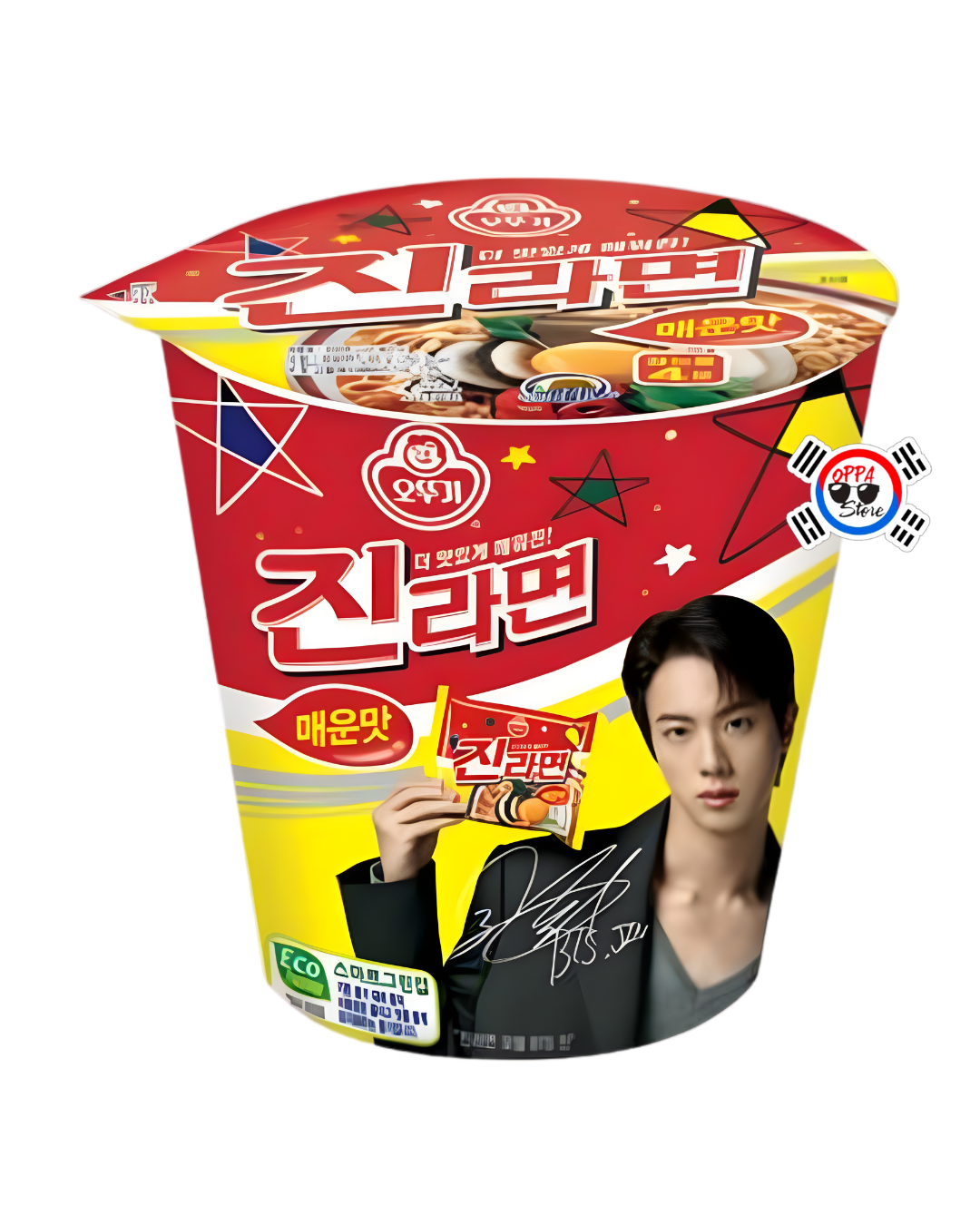 Ottogi Jin Ramen Spicy Bowl 65gr es un ramen instantáneo muy popular en Corea y el mundo. Sus fideos presentan una textura masticable, con un sabor suave. El caldo tiene un profundo y delicioso sabor a res que se complementa perfectamente con el sabor de los fideos. Además contiene trozos de vegetales: cebolla verde, hongo shiitake y zanahoria, los cuales agregan una textura especial a la sopa. Tiene un ligero toque picante que alegrará tu paladar.