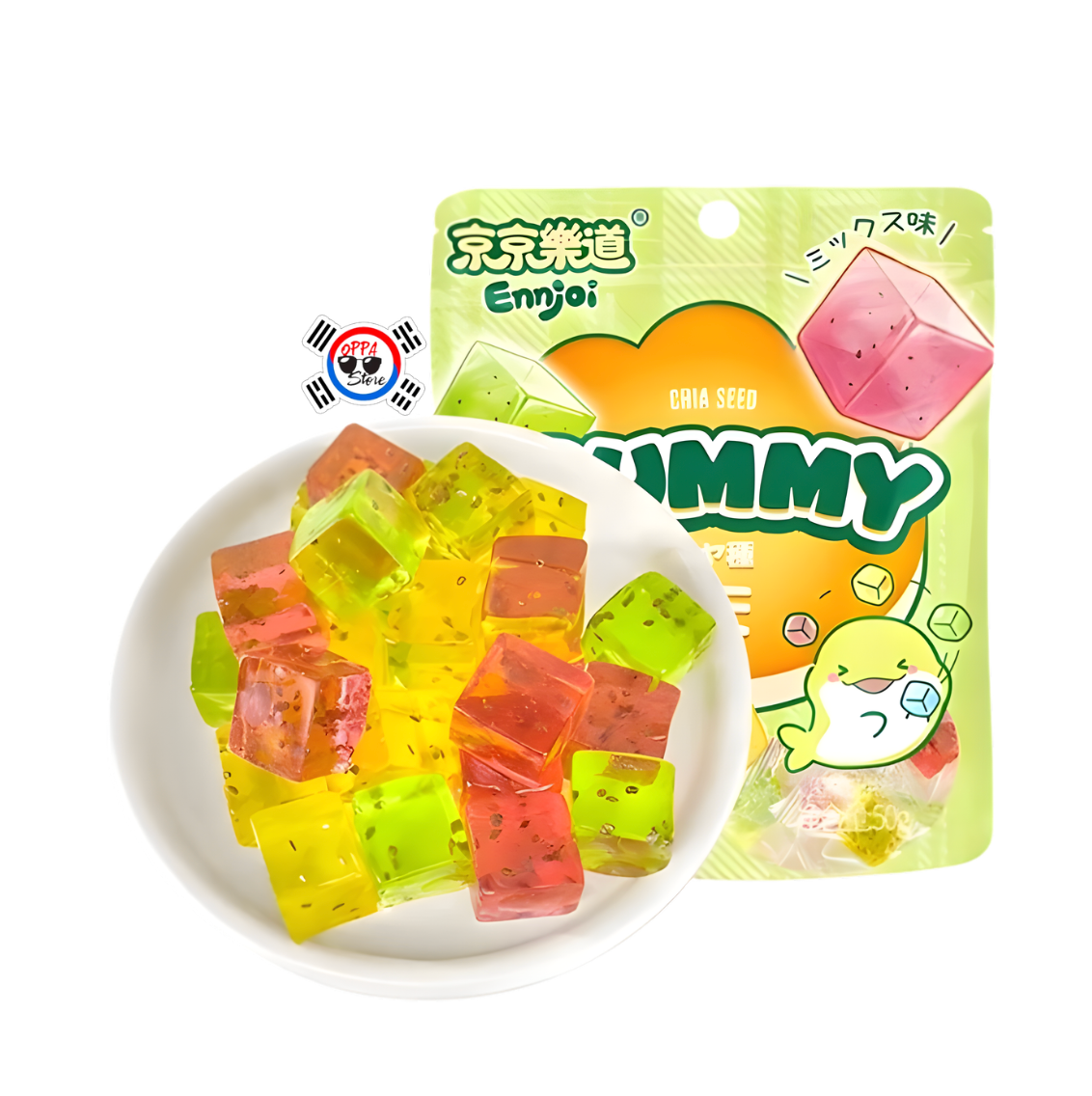 Ingredientes: Jarabe de maltosa, azúcar, trehalosa, aditivos alimentarios (E420-sorbitol líquido, carragenano, pectina, ácido DL-málico, E330-ácido cítrico, citrato de sodio, agar, manteca vegetal, cera de carnauba, E102-tartrazina, E129-rojo allura, E133-azul brillante), zumo de fresa concentrado (≥30%), zumo de maracuyá concentrado (≥30%), zumo de manzana concentrado (≥30%) (contenido de zumo recuperado), semillas de chía, aroma alimentario.